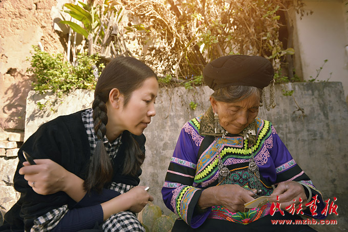 盧潔瑩下鄉(xiāng)向彝族老前輩請教彝繡圖案樣式(索玉文化美學(xué)創(chuàng)意有限公司 供圖)