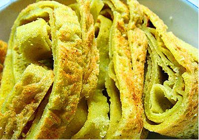 由于綠豆鍋巴的制作和原料有所不同,它的味道也不同。綠豆鍋巴粉在鍋內(nèi)烙成,呈四周薄中間稍厚,入鍋后,爐堂的松針毛毛噴噴火一燒,頓時鍋內(nèi)的鍋巴粉呈現(xiàn)出無數(shù)小氣泡,制成后切成條狀,切口有無數(shù)的小孔,像海綿狀,食用時,入鹽、進味、可口,硬香中顯現(xiàn)脆嫩,鹽香中蘊含微甘。