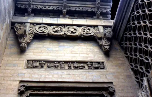 磚雕指在青磚上雕出山水、花卉、人物等圖案,是古建筑雕刻中很重要的一種藝術形式。