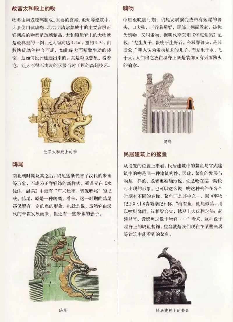 4. 正脊裝飾:在我國(guó)古代的很多建筑中,特別是一些等級(jí)較高的建筑中,其屋頂正脊上往往設(shè)有各色裝飾。除了常見的正脊兩端的吻合正脊中心的寶頂外,在正脊的前后兩個(gè)立面上,還會(huì)雕飾或塑有花、草或龍等。