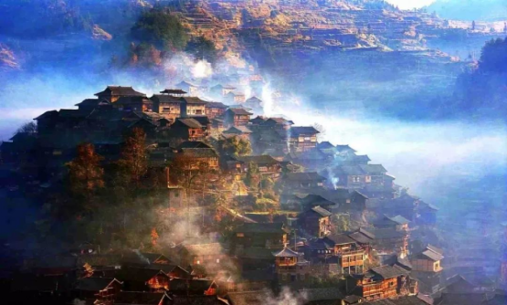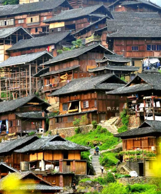 在雷山,苗寨吊腳樓依山而建,屋基開挖為上下二層,前檐柱或第二柱不落地,因此而得名吊腳樓,是苗族工匠們利用干欄式建筑在適應(yīng)山地發(fā)展和變異的經(jīng)典之作。