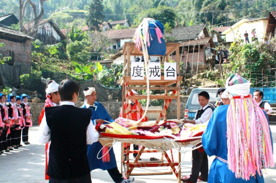 “度戒”臺(tái)(俗稱(chēng)“巫臺(tái)”,亦稱(chēng)“神臺(tái)”或“五臺(tái)山”)設(shè)在村子下面的一塊小地里,因這次有兩人“度戒”,便并列設(shè)了兩個(gè)“巫臺(tái)”。“巫臺(tái)”搭得較簡(jiǎn)單,先在場(chǎng)地上打4棵木樁,用四方桌作臺(tái)頂,桌子的4腳分別捆在木樁上,臺(tái)高約4米;“巫臺(tái)”前搭有一架有5個(gè)臺(tái)階的木梯,等“度戒”者送上臺(tái)后便把木梯砍掉;臺(tái)后有一張用大青藤編成的狀如蛛網(wǎng)的大網(wǎng),上面鋪著幾床新被子,約有10人對(duì)稱(chēng)拉開(kāi),等“度戒”師下令,“度戒”者從“巫臺(tái)”上仰面滾落下來(lái)。拉網(wǎng)的人乘“度戒”者墜落進(jìn)網(wǎng)之勢(shì),把他輕放于地上,并將手中之繩速向?qū)Ψ綊仈n,“度戒”師看了其落地的姿勢(shì)可以,此次“度戒”便算成功了。