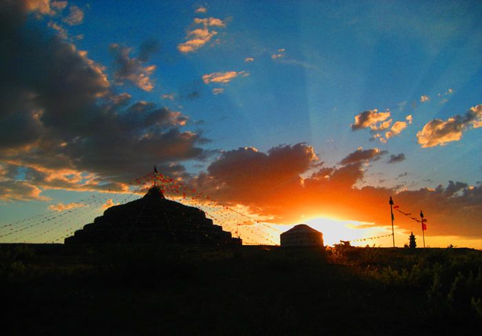 旅游中心所祭祀的“格根查干敖包”,原本屬于本土牧民祭祀的古老部落扎薩克敖包,曾經(jīng)由博教(薩滿教)大師開光,后來的佛教高僧對(duì)這座敖包又融入了符咒,實(shí)屬擁有“靈性”的正宗敖包。旅游中心為了充分展示遠(yuǎn)古敖包文化的魅力,按照蒙元時(shí)期形成的敖包規(guī)則予以拓展,即以故有的敖包為核心,由12座統(tǒng)一的小敖包,分布于規(guī)則的圓周線上,簇?fù)碇黧w敖包。蒙古族歷來崇尚數(shù)字的“13”,認(rèn)為這個(gè)數(shù)字既是成功的起點(diǎn),又是萬(wàn)事大吉的象征。這種由“13”組合而成的敖包寓意深刻,“10”是一個(gè)整數(shù),有整合之意,“3”是一個(gè)全數(shù),即代表著天、地、人的統(tǒng)一體,象征著完美無(wú)缺的蒼天之力。源于遠(yuǎn)古時(shí)期的博教,根據(jù)其長(zhǎng)生天學(xué)說“上蒼有99重天,下有人間輪相屬年和諧共存”之理念,主體敖包的石壁上制有祭典長(zhǎng)生天的99盞燈座,體現(xiàn)著其三元結(jié)構(gòu)的完美與蒙元時(shí)期正宗敖包的風(fēng)采和神威。
