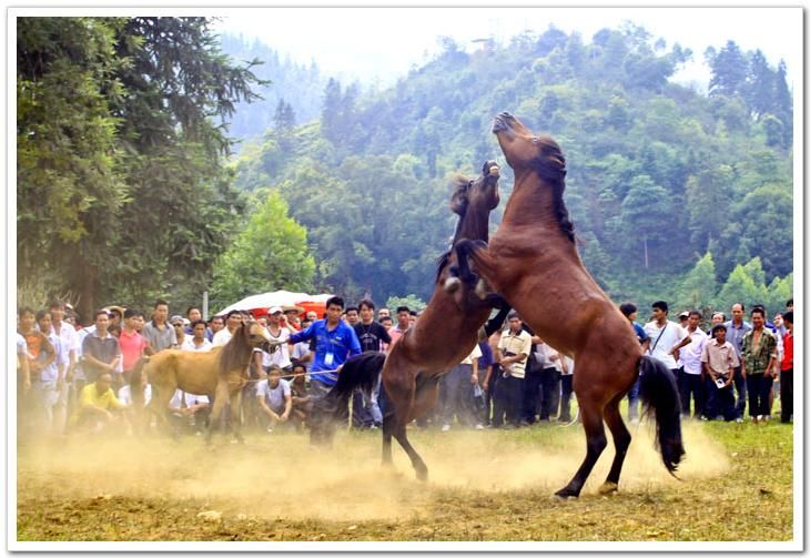 斗馬節(jié)這一天,縣城笙歌震天,鐵炮、粉槍齊鳴。穿著節(jié)日盛裝的各族群眾興高采烈,跳起歡快的蘆笙踩堂舞。這時精神抖擻的苗家馬主,牽著各自的馬匹,從四面八方云集斗馬場。先由馬主拈鬮分組初賽,兩兩相斗,出線者參加復賽和決賽,決出最后名次。對獲勝者評出一、二、三名,給戰(zhàn)馬披紅掛彩。