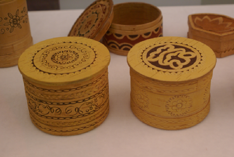 鄂溫克族的雕刻包括骨刻、木刻與樺樹(shù)皮刻。骨刻的工具是鐵制刻刀。骨刻制品一般有筷子、衣扣、板指、使用馴鹿時(shí)所用鞍子的配件、縫衣物時(shí)為拉緊線而用的拉線棒等,不同的用具上刻有不同的花紋。木刻的工具也是鐵制刻刀。木刻一般多用于神像、刀柄、煙鍋和白樺木制的馴鹿鞍具、背夾上。一般的花紋有“奧豪爾”,這種花紋有勾有彎,仿松樹(shù)形狀,有馴鹿不會(huì)跑掉的意思。背夾上的花紋則是犭罕 、馴鹿、松鼠、天鵝等。樺樹(shù)皮雕的工具用犭罕骨制成的刀,分二、三、四齒幾種。雕刻時(shí),先用小刀或錐子把圖案輕輕畫(huà)在樺樹(shù)皮上,再用犭罕骨刻刀耐心地刻出花紋圖案。圖案一般有云卷紋、菱形紋、水波紋、花鳥(niǎo)等。用顏料涂上藍(lán)、紅色,使圖案呈現(xiàn)出色彩對(duì)比和立體感。鄂溫克族樺樹(shù)皮制品有盆、碗、盒、桶、箱等多種多樣,其制品本身就是非常古樸風(fēng)雅的藝術(shù)品,再雕刻上各種花紋圖案,倍添精致、美觀。