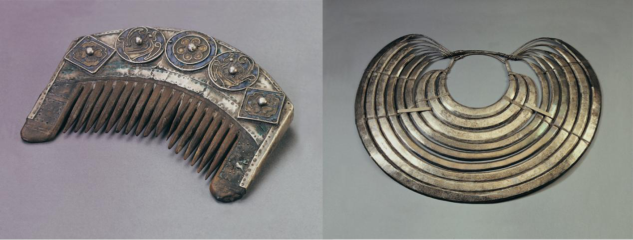 廣西龍勝侗族清代鑲銀嵌花木梳和湖南通道侗族民國時期九層銀項圈