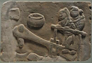 長31厘米,寬19厘米,厚5厘米,呈長方形。生動刻畫了一個推磨的場景。磨的一端為一婦女,一端為一小男孩。婦女頭梳圓形發(fā)髻,身著長裙、短上衣系長帶,雙手握推杠于胸前,眼睛注視著推杠另一端身高不及杠的小孩。小孩全身裸露,背朝外,頭向上昂起,看著高過頭頂許多的推杠,雙手作吃力地推杠狀。整個畫面將母子二人推磨時,母親憐愛孩子的情景淋漓盡致地表現(xiàn)出來。