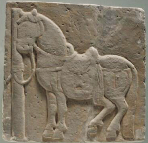 邊長30.5厘米,厚5厘米,呈正方形。配有鞍具和轡具,韁繩系在拴馬柱上。馬取立姿,似在歇息。馬首微頷,雙耳直立,頸部粗壯,身體肥碩,前腿挺直,后腿微曲,長尾及地。雕刻手法簡練,平實而質(zhì)樸。
