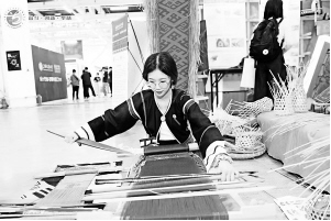 2021年5月,在第六屆全國大學生藝術展演活動現(xiàn)場,海南師范大學學生展示黎族腰織機織錦技藝。第六屆全國大學生藝術展演活動組委會供圖