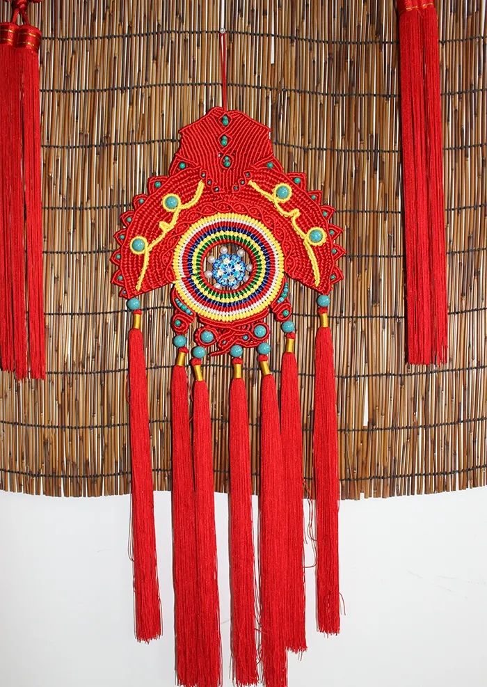 首先要選定編結(jié)材料,設(shè)計好色彩方案,用的線材可以是多種,根據(jù)需要進行顏色搭配。編完之后,要將結(jié)子抽緊定形,這是整個編結(jié)過程中最重要也最考驗技術(shù)的步驟。繩結(jié)在編好、抽好之后,修的工夫也不能馬虎,而注重細(xì)節(jié)。