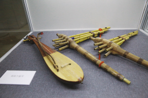 展出的侗族牛腿琴(左)、苗族六管蘆笙(中、右)。