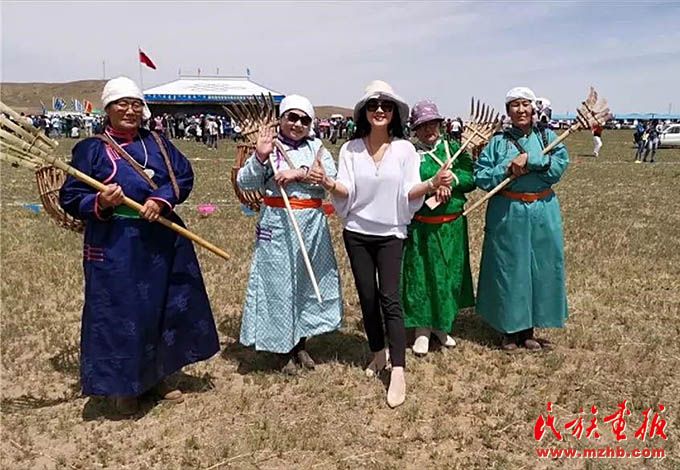 王金梅在錫林郭勒草原的夏季那達(dá)慕上體驗(yàn)?zāi)撩裆睢?/span>