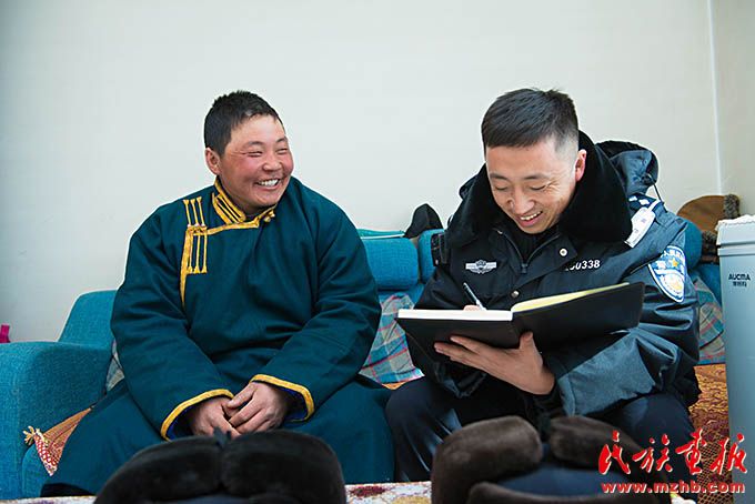 無論在哪個邊境派出所,敖日奇朗都跟牧民們以心交心,以誠相待,成為好朋友。如今,敖日奇朗在諾門罕布日德邊防派出所工作五年了,也常有新寶力格邊防派出所轄區(qū)牧民打來電話,咨詢法律問題,他每回都耐心地解答?!澳撩衽笥褌兊募冋尜|(zhì)樸平復(fù)了我剛到這里時躁動的心。邊境派出所是邊民生命財產(chǎn)安全的保障,隨時為轄區(qū)群眾牽線搭橋辦事。邊防警察與牧民的良好互動,會在關(guān)鍵時刻發(fā)揮重要作用,這恰恰也是我們開展走訪工作的意義所在?!卑饺掌胬矢锌?。