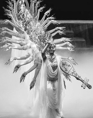 在敦煌舞的動(dòng)作素材積累方面,無(wú)論是對(duì)敦煌壁畫(huà)舞姿的歸類(lèi)、整理,對(duì)“敦煌舞特有的S型曲線運(yùn)動(dòng)規(guī)律”的發(fā)現(xiàn),以及“運(yùn)用中國(guó)古典舞蹈的節(jié)奏韻律,把靜止的姿態(tài)與其風(fēng)格統(tǒng)一的動(dòng)作過(guò)程結(jié)合起來(lái),形成比較完整的舞蹈運(yùn)動(dòng)和造型體系”,還是在創(chuàng)作層面上《絲路花雨》對(duì)“反彈琵琶”典型壁畫(huà)舞姿的發(fā)展,《千手觀音》對(duì)“千手”舞姿造型的無(wú)限變化發(fā)展,以及《飛天》超越人體動(dòng)作范圍極限對(duì)“三道彎”典型敦煌舞姿風(fēng)格的強(qiáng)化等,都是敦煌舞在動(dòng)作素材層面的積極建設(shè)和發(fā)展。