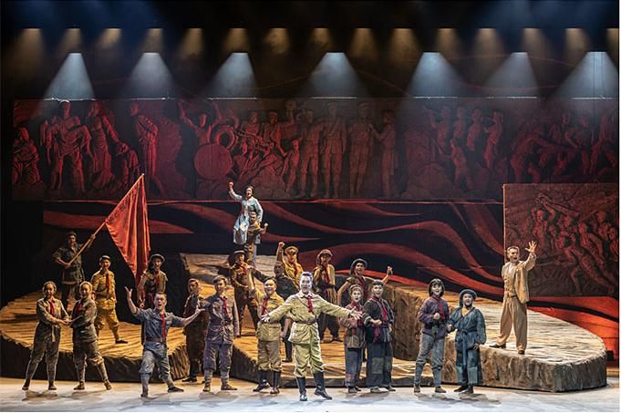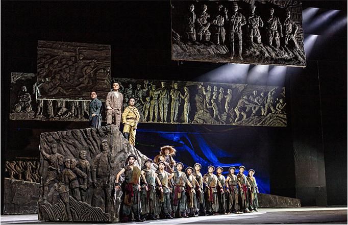 在舞蹈語言的設(shè)計上,編導(dǎo)融入當(dāng)代元素,使觀眾不但感受到審美的親切與現(xiàn)代感,而且還自然地進入回望歷史的情境,對其思想內(nèi)涵的理解更為準(zhǔn)確。該劇的道具使用和調(diào)度也頗為大氣,令人印象深刻。一組斜坡狀的大型舞臺道具不但由群眾演員直接移動而實現(xiàn)即時的場景調(diào)度,還可使演員上下和左右而行,最終組合成巨大的中國共產(chǎn)黨黨徽,輔助完成了人民英靈和英雄的形象塑造。