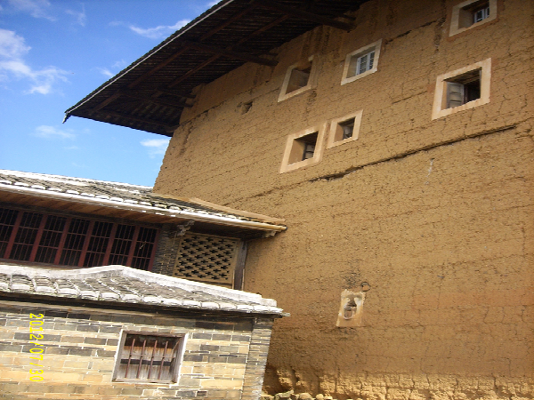 土樓和長城差不多,是用糯米、石灰、蛋清和泥土混合而成的外墻,內(nèi)部是用黃木和杉木,夏可抵暑氣,冬可抵冽風(fēng),還可自動(dòng)調(diào)節(jié)室內(nèi)的溫度。