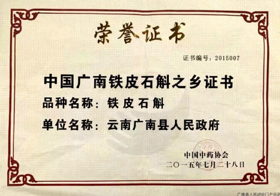 2015年7月28日,廣南鐵皮石斛被中國(guó)中藥協(xié)會(huì)授予“中國(guó)廣南鐵皮石斛之鄉(xiāng)”證書(shū)。(凌埡公司提供)