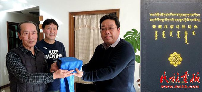 烏日根桑格(中)利用業(yè)余時(shí)間,與民族出版社蒙古文部原主任、資深編審卓日格圖先生(左一)合作出版《梵藏漢蒙對(duì)照詞典》。圖為向?qū)W者贈(zèng)閱該詞典。