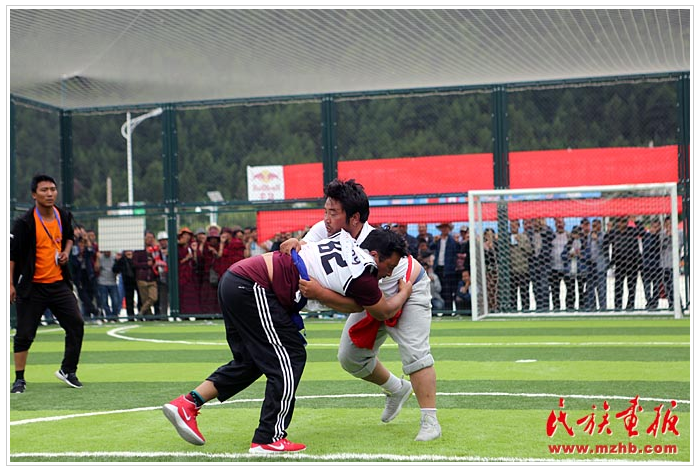 甘肅省甘南藏族自治州的迭部縣安多地區(qū)則巴邀請(qǐng)賽男子摔跤80公斤以上比賽(民族畫(huà)報(bào)記者 黃若天 攝影)