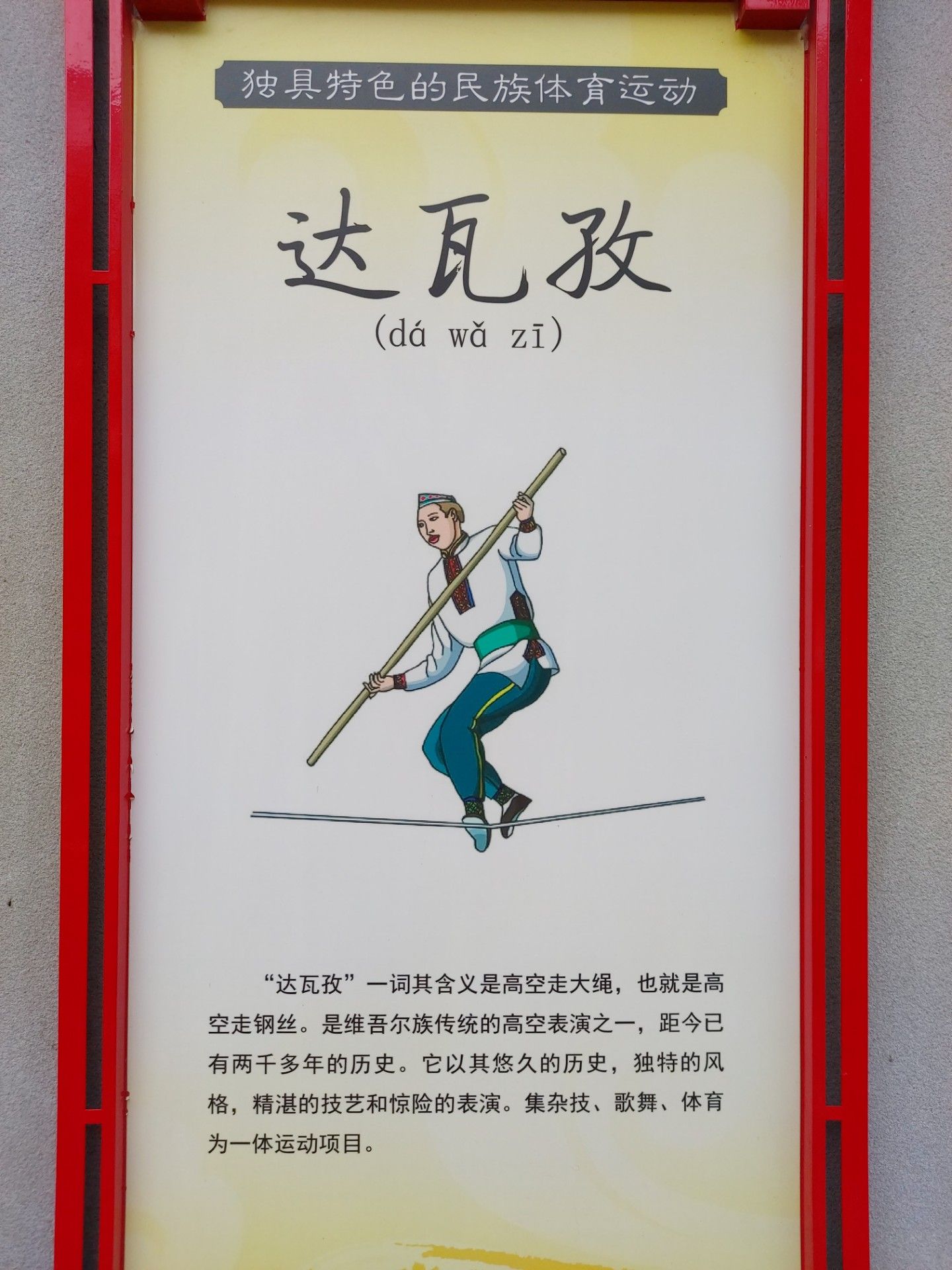 “達(dá)瓦孜”一詞其含義是高空走大繩,也就是高空走鋼絲。是維吾爾族傳統(tǒng)的高空表演之一,距今已有兩千多年的歷史。它以其悠久的歷史,獨特的風(fēng)格,精湛的技藝和驚險的表演。集雜技、歌舞、體育為一體運動項目。