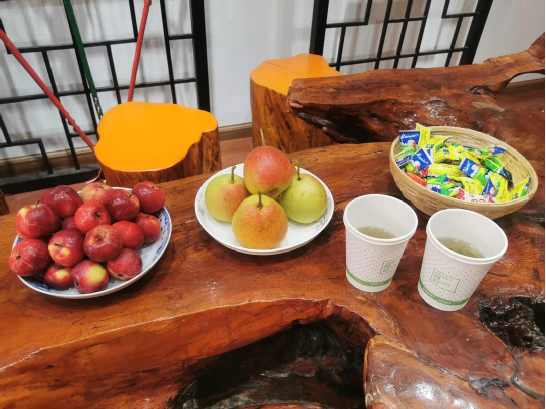 剛踏進(jìn)傳習(xí)所,就見(jiàn)何松康老師已準(zhǔn)備好茶水以及時(shí)下最新鮮的花紅、梨子等水果候著我們到來(lái)了。對(duì)于每一位來(lái)到傳習(xí)所了解白族霸王鞭文化的訪客,她都熱忱相待。