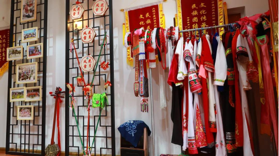 方正的堂屋里掛滿了何松康參加演出、培訓(xùn)的各種照片及霸王鞭、八角鼓、服裝等演出道具。院子的墻上專門請(qǐng)人繪了一幅霸王鞭的彩繪,旁邊書寫:“弘揚(yáng)白族傳統(tǒng)文化,傳承民間舞蹈藝術(shù)”。