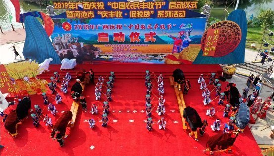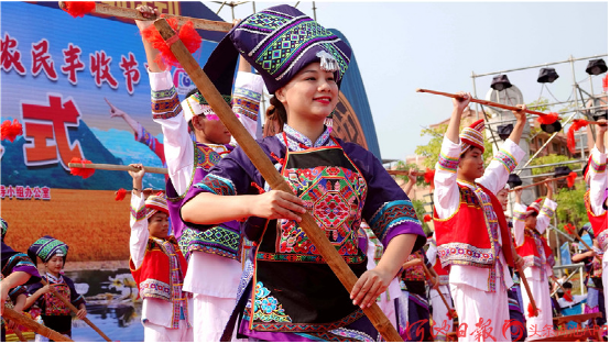 都安瑤族自治縣群眾打起扁擔(dān),歡慶“中國農(nóng)民豐收節(jié)”。