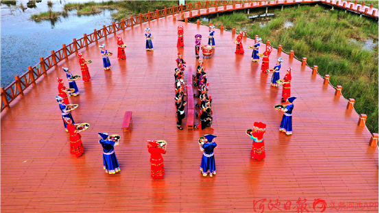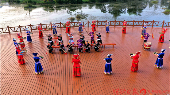都安各族群眾在澄江國家濕地公園表演打扁擔(dān)。