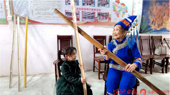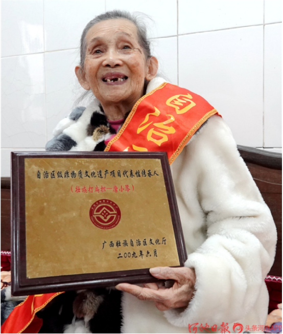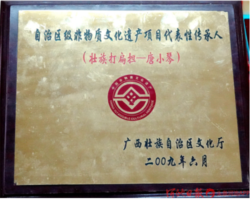 今年已經(jīng)88歲高齡的“壯族打扁擔(dān)”技藝傳承人唐小琴,她從小即耳濡目染,跟村里老人、長者學(xué)習(xí)打扁擔(dān),后因打扁擔(dān)需要指揮,又學(xué)習(xí)皮鼓打法。1961年4月,唐小琴從學(xué)校調(diào)入縣文化館任文化藝術(shù)輔導(dǎo)員,挖掘整理了《壯族打扁擔(dān)》《板凳舞》《斑鳩舞》等一大批傳統(tǒng)舞蹈,并多次在自治區(qū)、河池地區(qū)的比賽、調(diào)演上獲獎。1986年退休后,仍然致力于《壯族打扁擔(dān)》的傳承工作,2004年,組建都安縣老干康樂藝術(shù)團(tuán),帶動安陽鎮(zhèn)退休老人學(xué)習(xí)打扁擔(dān)技藝。2009年,她被確認(rèn)為自治區(qū)非物質(zhì)文物遺產(chǎn)項(xiàng)目“壯族打扁擔(dān)”代表性傳承人。