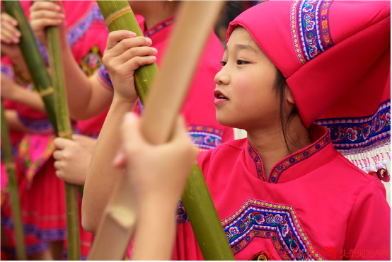 一群少年兒童歡聚在都安縣文體廣場打起扁擔(dān),喜迎三月三。