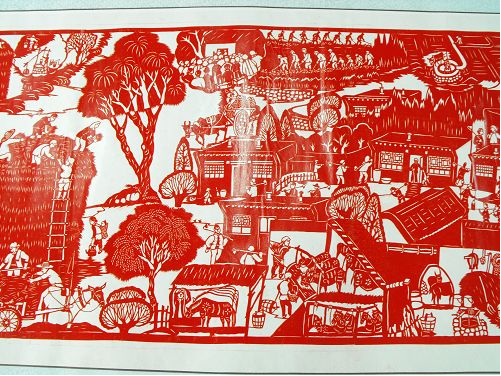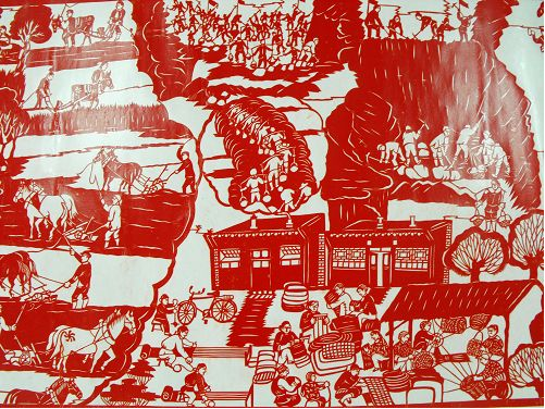 2、達拉特紀事剪紙的歷史價值很高,《農民紀事圖》上卷記載了從建國到現(xiàn)在農村的發(fā)展變化,在作品中我們看到了很多瀕臨失傳的農村生產(chǎn)生活工具和生產(chǎn)方法,也能看到黨和國家在每一年出臺的各項惠農利民政策,對于研究歷史具有重大的文獻價值。