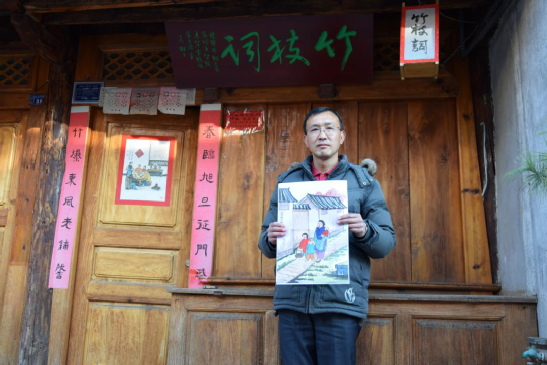 張旭東的童年,是在祖父母的耳提面命中度過的,他跟隨老人習(xí)書繪畫,學(xué)禮明俗。到了弱冠之年,他逐一拜訪古鎮(zhèn)中尚在的民國時(shí)期出生的老輩文人,向他們請(qǐng)教劍川白族傳統(tǒng)民俗,并做了系統(tǒng)梳理,這也為他后來繪制年畫、撰寫春聯(lián)打下扎實(shí)的理論基礎(chǔ)。