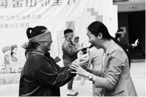 為進(jìn)一步弘揚(yáng)睦鄰友好、鄰里相親的傳統(tǒng)美德,阿勒泰市金山路街道以社區(qū)為單元、居民為主體,舉辦了“與鄰為善,以鄰為伴”“讓愛零距離”等形式多樣的“睦鄰節(jié)”活動(dòng),各社區(qū)還分別表彰了“最好鄰居”“最美婆婆”“模范丈夫”“民族團(tuán)結(jié)之星”等。圖為社區(qū)開展的趣味運(yùn)動(dòng)會(huì)——“盲人”吃香蕉游戲。