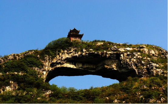 仙橋山位于貴州甕安縣城西南5公里的仙橋村,雄峙于南北伸展的長嶺之巔。山頂有一長方形穿洞,遠(yuǎn)望似一面中天明鏡,又若仕女發(fā)髻上的一匹玉簪。民間傳說,那高懸的“橋洞”,是神通廣大的仙人張三豐發(fā)怒時(shí)一拳擊穿的。站在“橋”下仰望“橋”頂,如巨粱橫亙天際,青崖黛壁,輝映云天。天衣無縫的“橋身”和兩邊的“橋墩”,渾然一體,構(gòu)成跨度約40米,寬20米,高約35米的“橋拱”?!皹蚬啊北泵娴摹皹蚨铡蹦_有形狀各異的石洞,曲徑相通。洞壁有形似人腳印石凹,傳說是仙人張三豐到此云游留下的足跡。