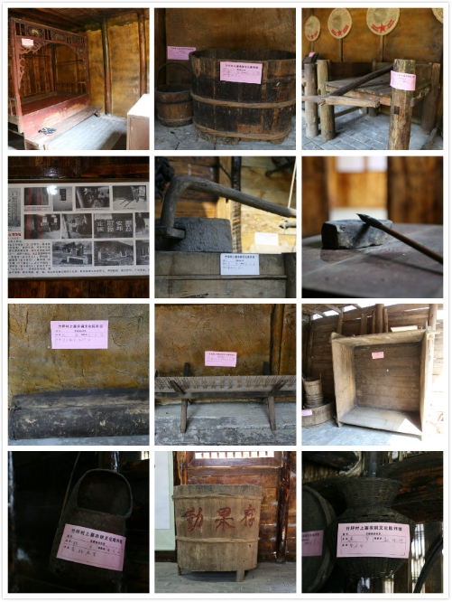 “農(nóng)耕文化陳列館”是由兩棟傳統(tǒng)的木質(zhì)民房改建,從大門(mén)進(jìn)來(lái),門(mén)的兩邊放置有農(nóng)具,右側(cè)一個(gè)是存儲(chǔ)糧食的倉(cāng)庫(kù),沿著倉(cāng)庫(kù)邊上的石階往上走,從小門(mén)進(jìn)去,大大小小的簸箕、飯甑、貓籮、魚(yú)籮等農(nóng)具應(yīng)有盡有。