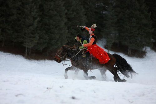 在傳統(tǒng)的竟技比賽場上,最激動人心的還是“姑娘追”它往往是全場比賽的壓軸戲。“姑娘追” 據(jù)說是由上古“追姑娘”的風(fēng)習(xí)演變而來,至今既是哈薩克人最喜愛的娛樂項目,又是小伙子找對象談情說愛的好機(jī)會。