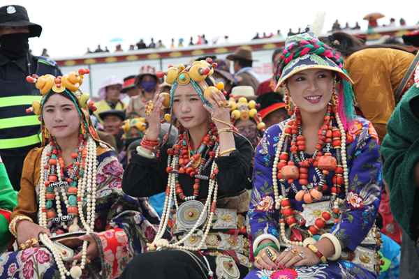 甘、青、川的藏族男子非常講究腰飾,有財力的男子一般都有一條鑲有僅、銀、玉的寬皮腰帶,腰帶上還掛有裝飾性的小刀、火鐮等。青海玉樹地區(qū)的婦女裝追求華麗,內(nèi)衣外袍色彩艷麗,綢緞腰帶留長飄帶,頭、頸、發(fā)、腕、指和腰佩有金、銀、玉、珊瑚、瑪瑙等珍貴飾品,一套豪華女裝價格不菲。因此有諺語:“男人的財富系在腰上,女人的嫁妝穿在身上”之說。云南藏區(qū)的女裝上身穿長袖彩綢衫,外著無袖大襟長袍,長袍領(lǐng)口、襟邊和下擺鑲有錦緞,色彩艷麗。云南一些藏區(qū)的女子喜歡穿百褶裙,顯示出女性的優(yōu)美身材。西藏工布地區(qū)的女裝顯得簡約,先穿有袖內(nèi)衣,再將氆氌拚縫成大片,中間挖一圓口,穿時將頭伸進(jìn)圓口兩端垂與胸背,再束腰帶即可。藏族婦女的頭飾也很多,有碎辮的、有戴頭巾的,有盤發(fā)的,西藏山南地區(qū)的巴珠最有特點(diǎn)。巴珠是三枝狀,平系于頭頂兩枝向前,將分梳的兩條發(fā)辮分別盤于兩枝上。其上部還有一弓形物,與三枝狀兩端連接,上系絲織品,邊緣鑲珍珠、珊瑚等。女子13歲戴巴珠,象征已經(jīng)成人。金邊帽也很有特色,藏區(qū)的男女都戴。帽型為桶狀,周邊鑲織錦,內(nèi)有四片耳片,兩大兩小,天冷時放下耳片護(hù)耳。狐皮帽形似倒掛的金鐘花,以布作底層,再縫上狐貍皮,帽后有兩條長飄帶。男帽稍高,女帽較低。