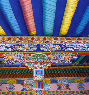 柱頭裝飾包括柱頭、斗拱、大梁等部位的雕刻、彩繪。在藏族居室中柱子、橫梁位置顯要,因此對這部分的裝飾在整個室內(nèi)裝飾中至關(guān)重要。無論高雅精致的殿堂還是普通百姓的民居都充分認(rèn)識到這一點(diǎn),進(jìn)行合理裝點(diǎn)以求莊嚴(yán)、堂皇、舒適的效果。就拿寺廟集會大堂的柱頭、橫梁來講,裝飾十分考究。天花板下的椽子木頂端整整齊齊地、略有間隔地排列在大梁上方,用彩繪的辦法進(jìn)行裝點(diǎn)。椽子至大梁之間夾著兩道橫杠,其上道用累卷疊函凹凸方格木雕處理,下道橫杠用蓮花瓣依次排列的雕刻或彩繪完成,這種裝飾是約定俗成的,上下圖案不能隨意調(diào)換。橫梁上的裝飾大多采用填充連接長方格來進(jìn)行。橫梁表面劃分大小等同的長方格,這些連接的長方格內(nèi)或填寫梵文經(jīng)文,或繪各種花卉,用這樣的手段裝飾大梁。柱頭與橫梁之間是斗拱,藏族建筑對斗拱的裝飾非常講究。斗拱分兩層,上為長弓,下為短弓。斗拱長短兩弓本身形狀要精心雕摟,其表面也用雕刻著色的辦法加以渲染,以求良好的裝飾效果。斗拱裝飾有簡有繁,最簡單的斗拱形狀為梯形,這種不加任何雕飾的斗拱多見于底層的儲存室內(nèi)。而寺廟建筑大堂、佛堂之類重要殿堂內(nèi)的斗拱是經(jīng)過精心雕鏤的藝術(shù)品,尤其是斗拱長弓形狀千姿百態(tài),通常見得較多的有祥云狀,此外還有各種花瓣狀,其裝飾效果相當(dāng)強(qiáng)。除了斗拱形狀的雕刻外,表面上雕刻各種圖案獲得錦上添花的效果。長弓中心雕刻佛像,兩邊及邊緣雕刻祥云、花卉、整個斗拱表面顯得飽滿、大方。柱子、柱頭也是裝點(diǎn)的一個良好的空間,柱子形狀有圓有方,也有部分多角柱。柱子最上面的部位或雕或繪花瓣,在下是長城箭垛式圖案,這兩樣圖案的下面是短簾垂鈴式圖案,所有柱頭裝飾圖案基本上按此模式制作。除了雕鏤精細(xì)的寺廟大殿柱頭大梁裝飾以外,大量的柱頭裝飾見于藏族民居室內(nèi)。民居室內(nèi)柱頭大梁裝飾的基本走向、風(fēng)格與寺廟裝飾設(shè)有大的區(qū)別,彩繪圖案、顏色運(yùn)用、布局結(jié)構(gòu)除了個別外,與寺廟裝飾相同,只是民居室內(nèi)柱頭大梁裝飾多半是彩繪,幾乎見不到雕刻,這是經(jīng)濟(jì)條件所限呢還是等級待遇不同不得而知。兩者除了裝飾上的簡繁區(qū)分之外其余部分很好地保持了藏民族建筑風(fēng)格的一同性。