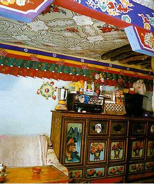 藏族民居室內(nèi)裝飾講究工整、華麗、亮堂,上至天花板下至與地板相接的墻角都采用雕刻、彩繪等藝術(shù)手段加以裝點(diǎn),尤其是橫梁、柱頭和大門等木結(jié)構(gòu)空間是充分展示裝飾才能的地方,在這里裝飾效果盡其所能。此外寺廟重點(diǎn)佛堂,回廊墻壁上繪制彩畫,這也是一種重要的裝飾手段,而百姓居室內(nèi)的墻壁上用繪制花卉、彩條來取得裝飾效果。