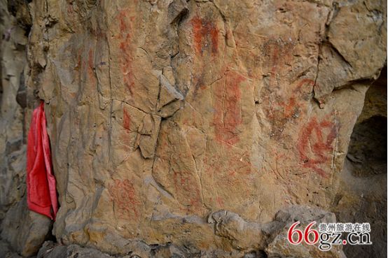 同時,在金山洞壁上的清代壁題也數(shù)量眾多,既有題詩,又有紀事,還有祝文,分別題于清乾隆、道光、咸豐年間。明顯可見“貴州貴陽府”和“貴陽府廣順州”等字樣。還有1949年以后的毛主席語錄,均以赭色書寫。據說時至今日,仍有村民在巖下洞口焚香秉燭,寄拜巖神,祈禱康健。現(xiàn)在在巖石上還能看到祈福的紅布和被煙火熏黑的巖洞。