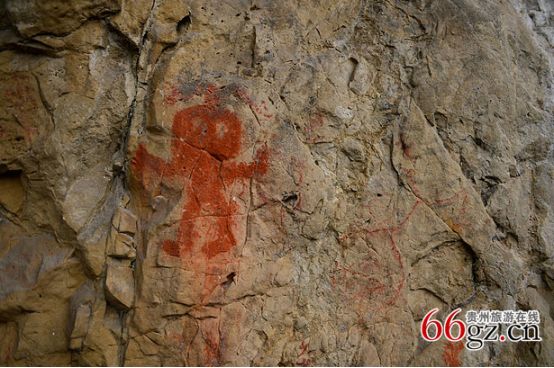 據資料載,金山洞古代崖畫以赭色涂繪人、馬、狗等等,隱約可見形態(tài)各異的大小圖像二三十個。人物多作行走狀,亦有雙手高舉者,似乎在祈禱。從其畫風觀察,與相距不遠的省級文物保護單位--長順龍家院崖畫十分相似。