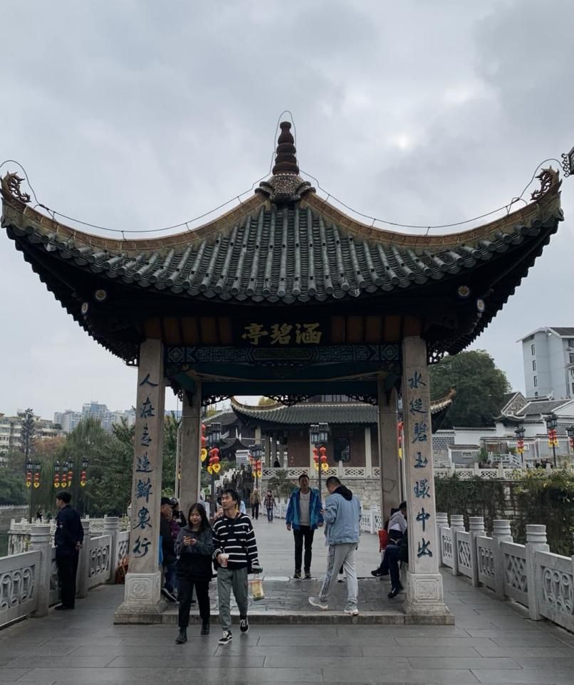 第二部分是甲秀樓。甲秀樓為三層三重檐四角攢尖頂穿斗式木結(jié)構(gòu)建筑,面闊三間,高約22.9米,紅欞雕窗,朱梁碧瓦,白石巨柱托檐,雕花石欄相護(hù)。甲秀樓歷來為文人墨客雅集之處,留下碑記、丹青、詩聯(lián)甚多,其中以清代田雯《重修甲秀樓碑記》、畫家鄒一桂《山水覌我圖冊—涵碧潭》、楹聯(lián)大家劉韞良《甲秀樓長聯(lián)》最具代表。