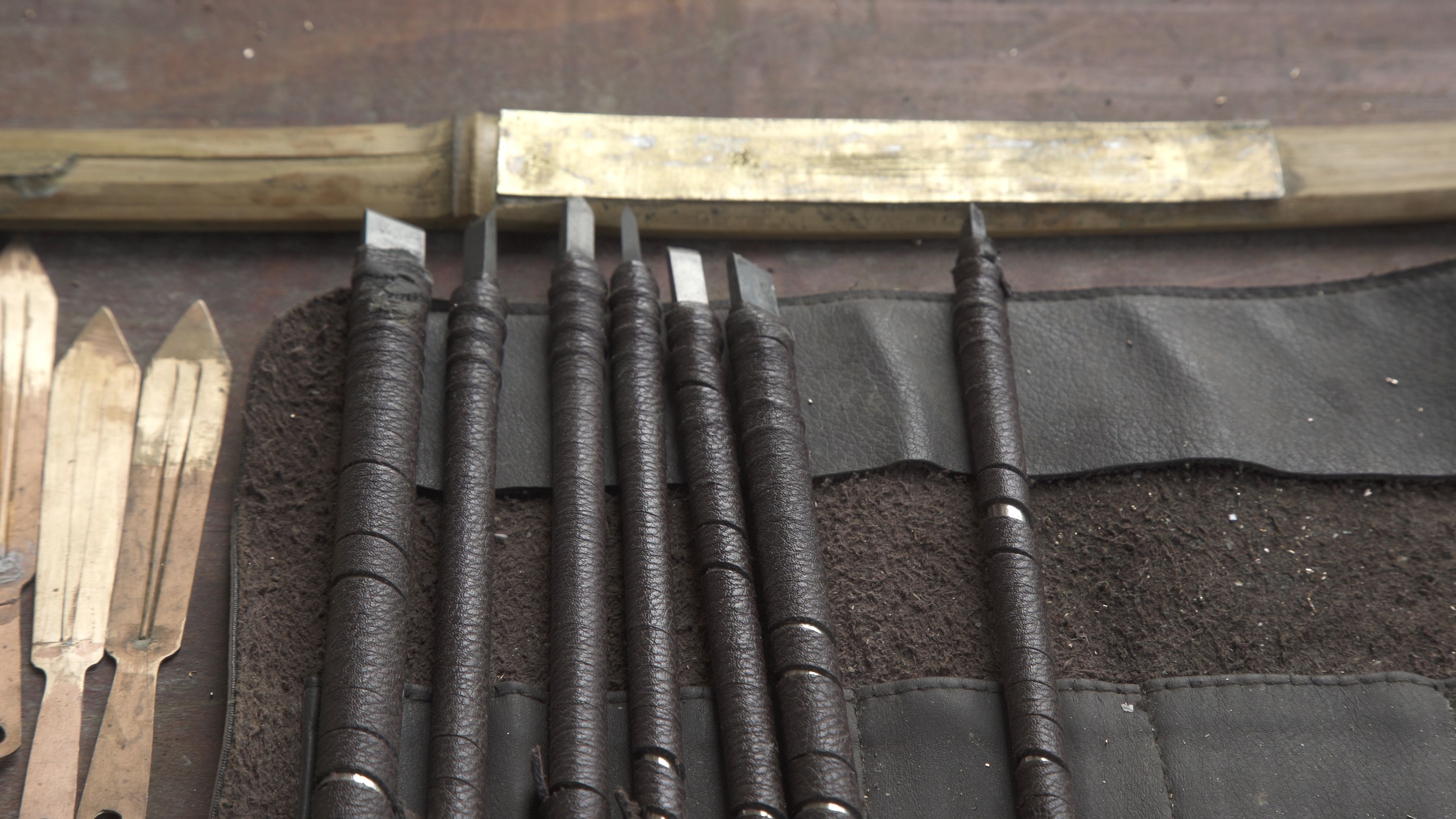 圖片說(shuō)明:貴州貴陽(yáng)清鎮(zhèn)市流長(zhǎng)鄉(xiāng)腰巖村苗族制作口弦所需工具-鑿子