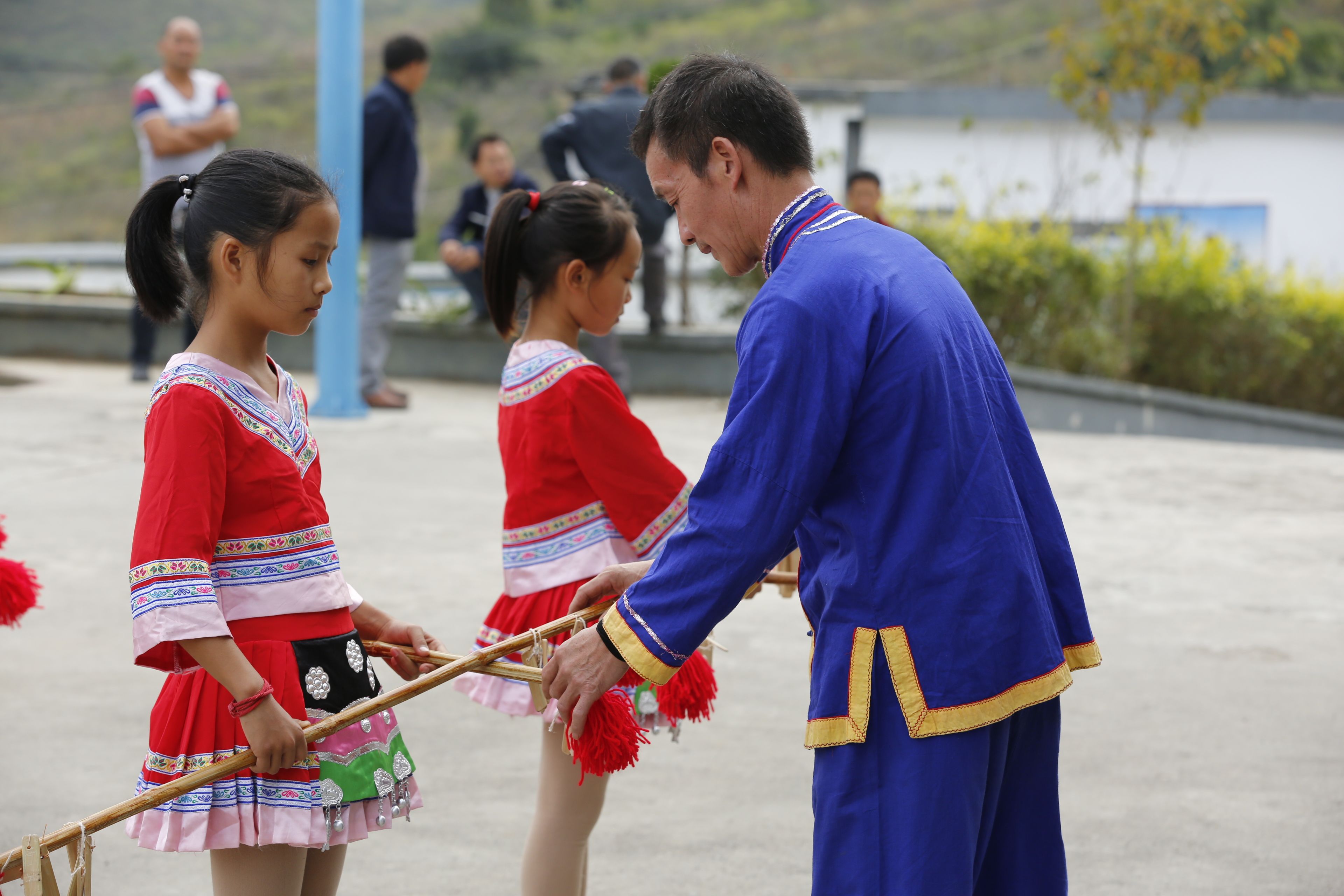 圖片名稱:貴州貴陽苗族長竹舞傳承人教孩子們持竿手法