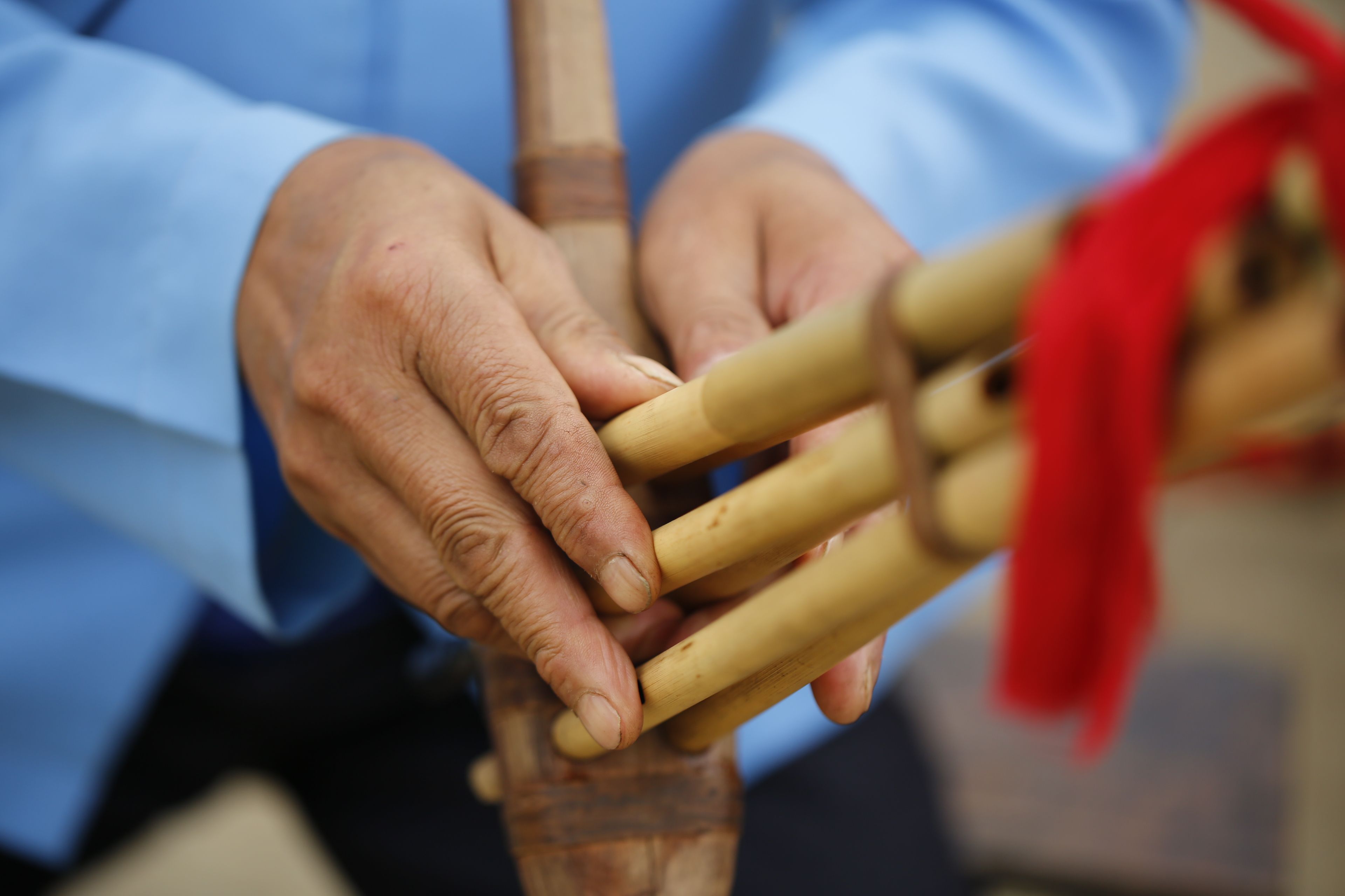 圖片說(shuō)明:貴州貴陽(yáng)苗族花鼓舞傳承人鄧開(kāi)倫教授他人吹奏蘆笙